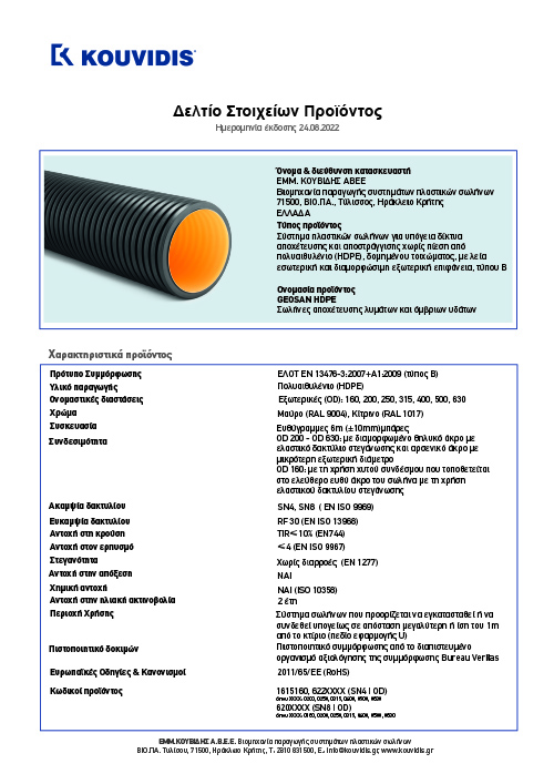 24/08/2022 Δελτίο στοιχείων προϊόντος GEOSAN HDPE TIP Rezultatele testelor FILE . SIZE DESCĂRCARE (RO) DESCĂRCARE (EL)